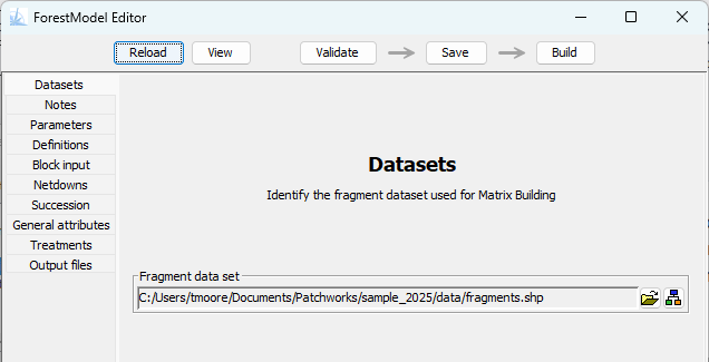 The editor will initially display the dataset pane. Use the file chooser button to select the fragments.shp file from the C5 sample data folder.