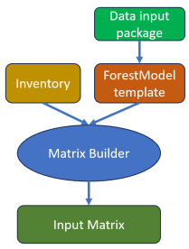 The inputs to the model – inventory, stratification variables, yield curves, succession, treatments, responses, indicators, etc. – are organized into a set of related tables. The semantics of these tables are well defined: the tables have agreed upon standard names with agreed upon columns headings, and the contents have specific meaning. We will refer to this set of related tables as the data input package.