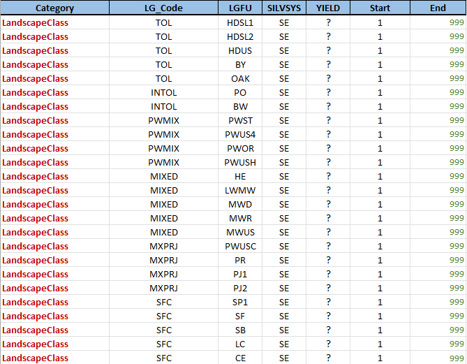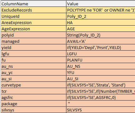 This table contains a mapping between the symbolic variable names used in the template and the actual columns that exist in the inventory. Although the inventory datasets used for forest management plan modeling in Ontario have some standardization, there is room for variability and in practice no two files seem to be formatted in the exact same way.