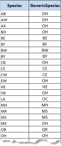 As the template attaches volumes to stands the recoding will be used to aggregate the detailed species into generic species curves. Elsewhere in the model only the generic species codes are used. To make this compression from detailed species to generic species the template will first transform the GenericSpecies table into lists of all of the minor species associated with each generic species.