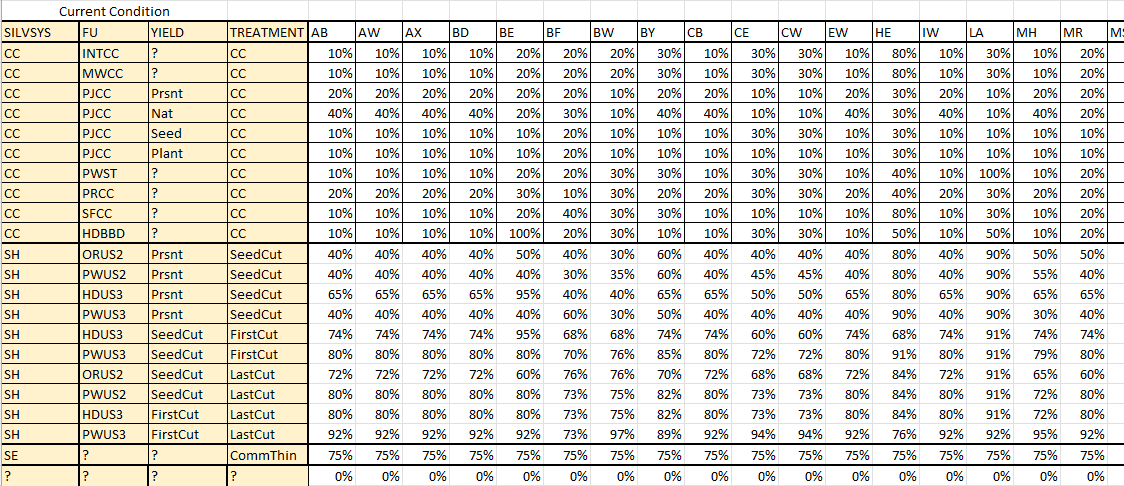 This table contains three rows of curve table references: one for stand-based curves, one for strata-based curves, and one that describes how product proportions change through time. Stand-level curves are based off of detailed inventory characteristics from the recent lidar-based inventory, and are used for the first rotation. Strata-level curves are developed in the usual way, and are applied to second rotation and post-successional stands where the detailed stand observations are no longer available.